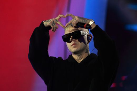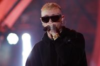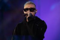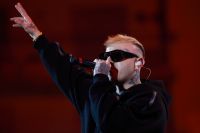 Rapper Lazza opens the event called "Tra Palco e città" at the Suzuki Stage, during the 74th edition of the Sanremo Song Festival. Among the songs sung also "Cenere", with which he ranked second last year. Rap music now represents a form of art, redemption and economic fulfillment for many young musicians in Europe and around the world. Photos are available for editorial use.