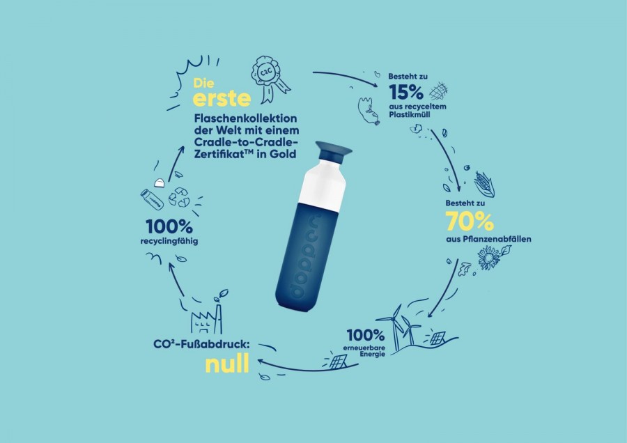 Schon seit 2009 verfolgt Dopper die Mission, Plastikabfälle, inbesondere in den Ozeanen, zu reduzieren. Der Verzicht auf Einwegflaschen aus Plastik ist dabei der erste Schritt. Dopper geht aber noch deutlich weiter und lässt die nachhaltigen Bestrebungen auch in die Produktion der wiederverwendbaren Trinkflaschen einfließen. Das Cradle-to-Cradle-Zertifikat® in Gold zeichnet die Dopper Original nun als weltweit nachhaltigste Trinkflasche aus. Das Cradle-to-Cradle-Zertifikat® Das Cradle to Cradle Products Innovation Institute hat es sich zum Ziel gesetzt, den Übergang zu einer Kreislaufwirtschaft voranzutreiben indem es den globalen Maßstab für Materialien, Produkte und Systeme setzt, die sich positiv auf Mensch und Umwelt auswirken.